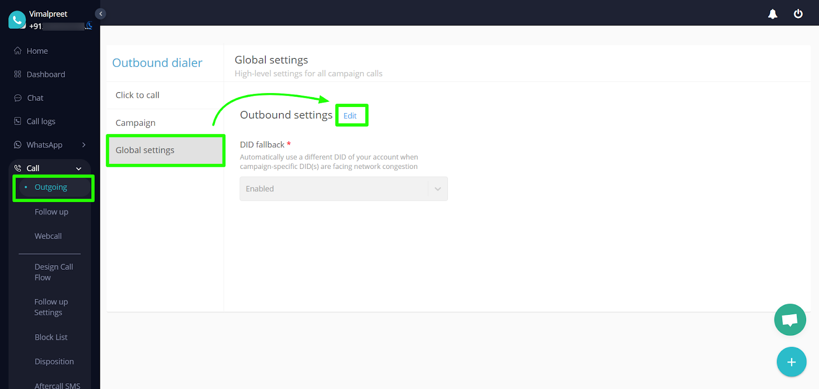 Manage → Campaign → Global Settings → Edit Outbound Settings → toggle **DID Fallback**.