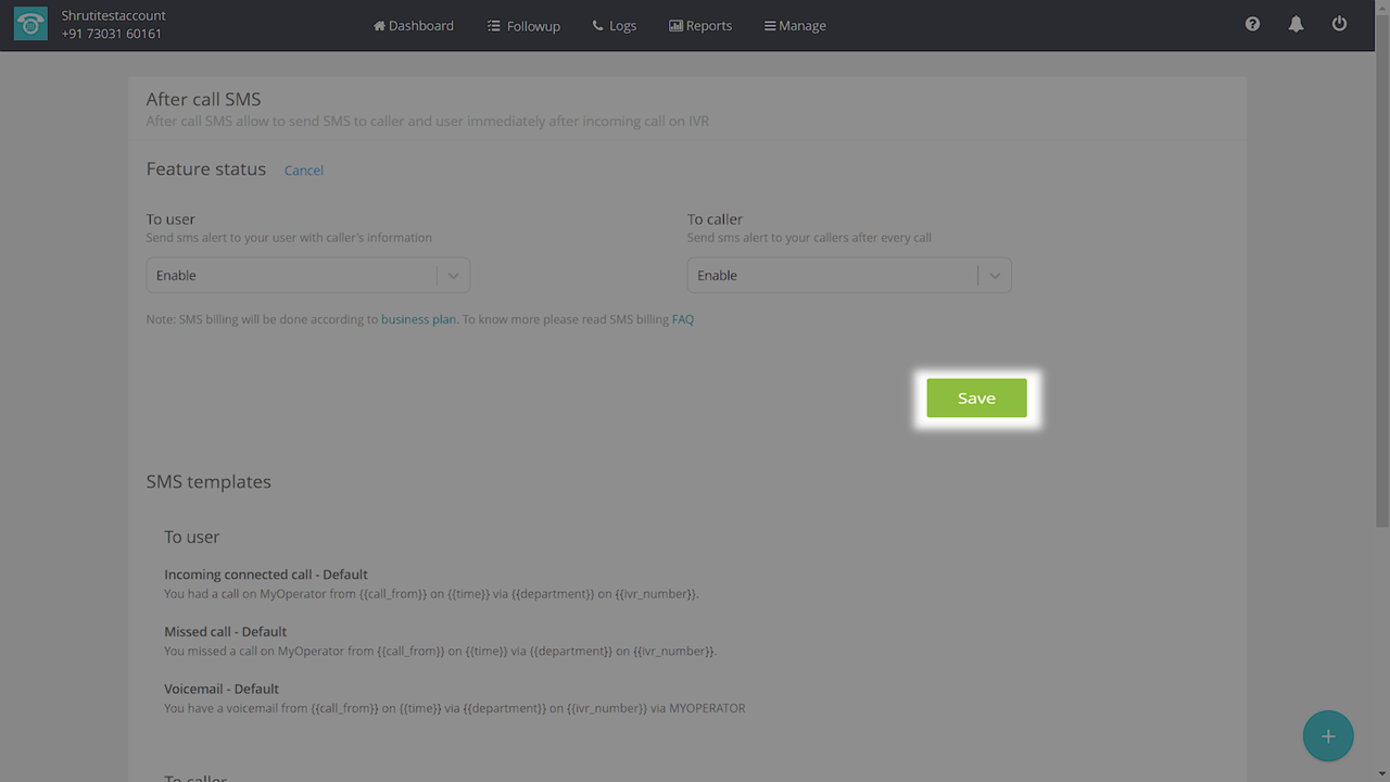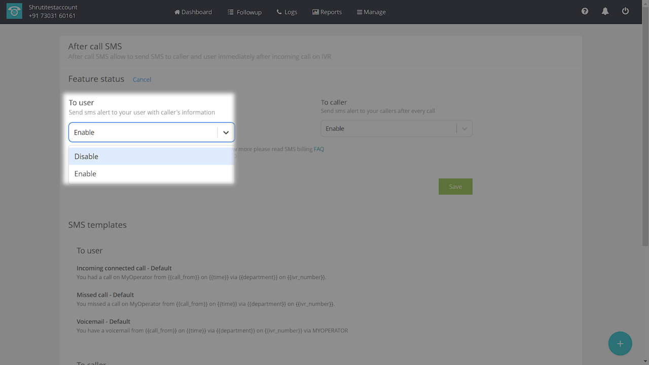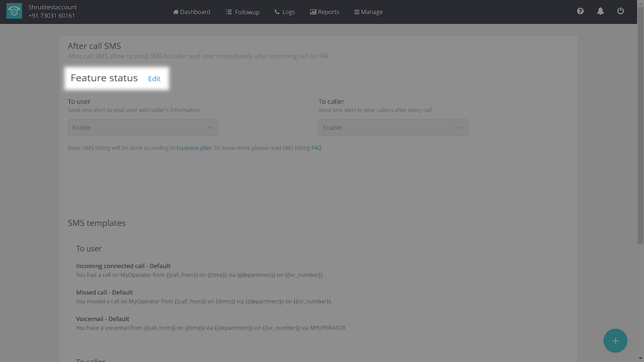 1. Go to “Manage” from the MyOperator dashboard. 2. Click on “After call SMS”. 3. Click on “Edit” in the feature status. 4. Enable/disable the feature for users from the drop-down menu. 5. Enable/disable the feature for callers from the drop-down ...