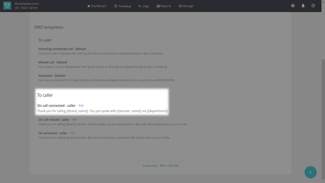 6. You can also edit the template for the callers. Admin will receive a mail in case of any rejection of the SMS template. And the SMS template will be set as default.