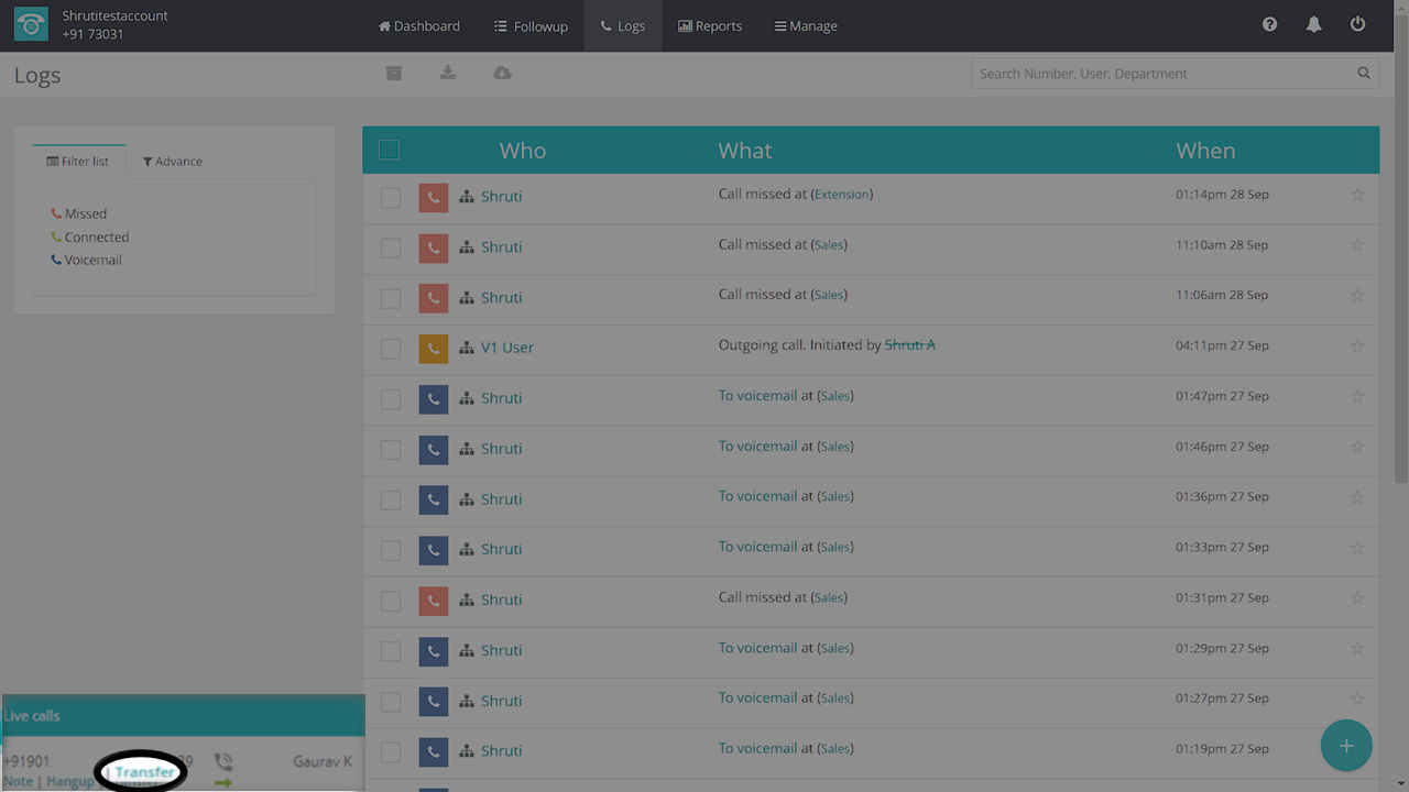 To transfer an ongoing call directly from the web panel, follow the steps mentioned below: