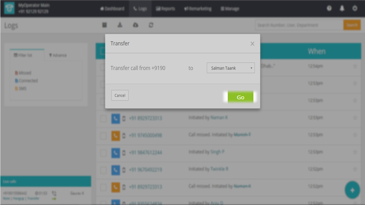 3. Choose the user to whom you want to transfer the call and click on “Go’’.
