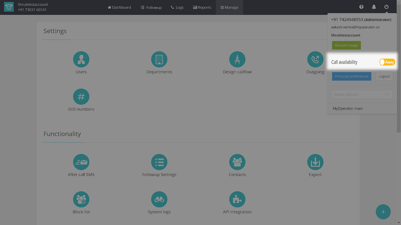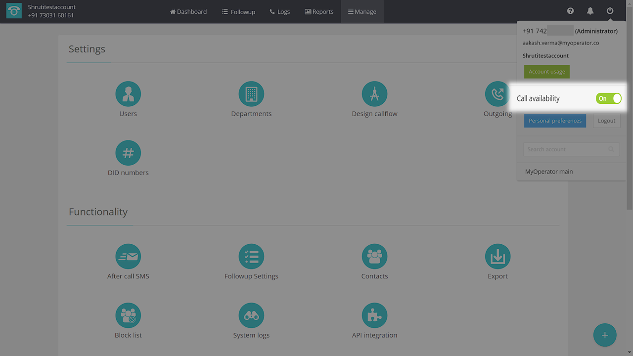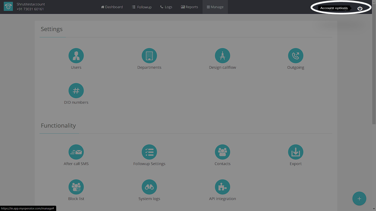 Login to your MyOperator panel & click on the “Accounts option” at the top right.