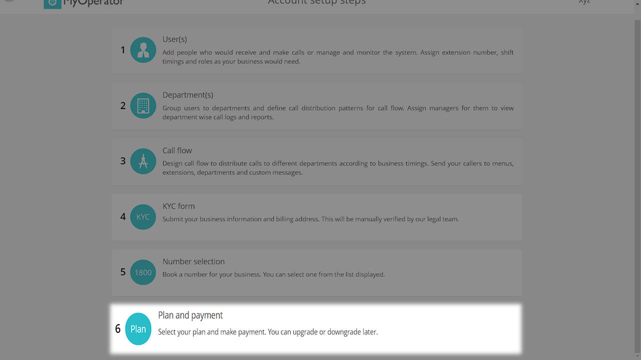 1. Login to your MyOperator panel and click on “Manage” at the top. 2. Click on "Billing" in Accounts Section. 3. Click on "Plan" from the left menu. 4. You can view your current plan including the other plan details. 5. You can Upgrade or downgrade ...