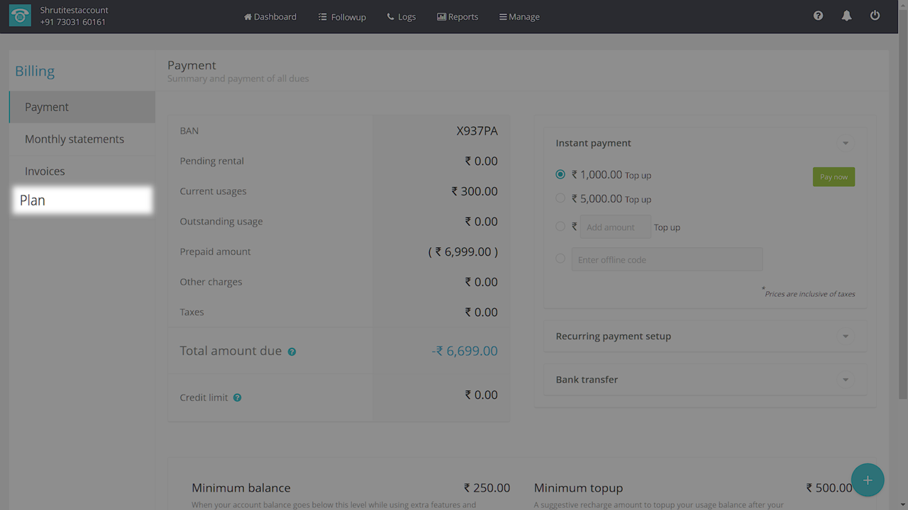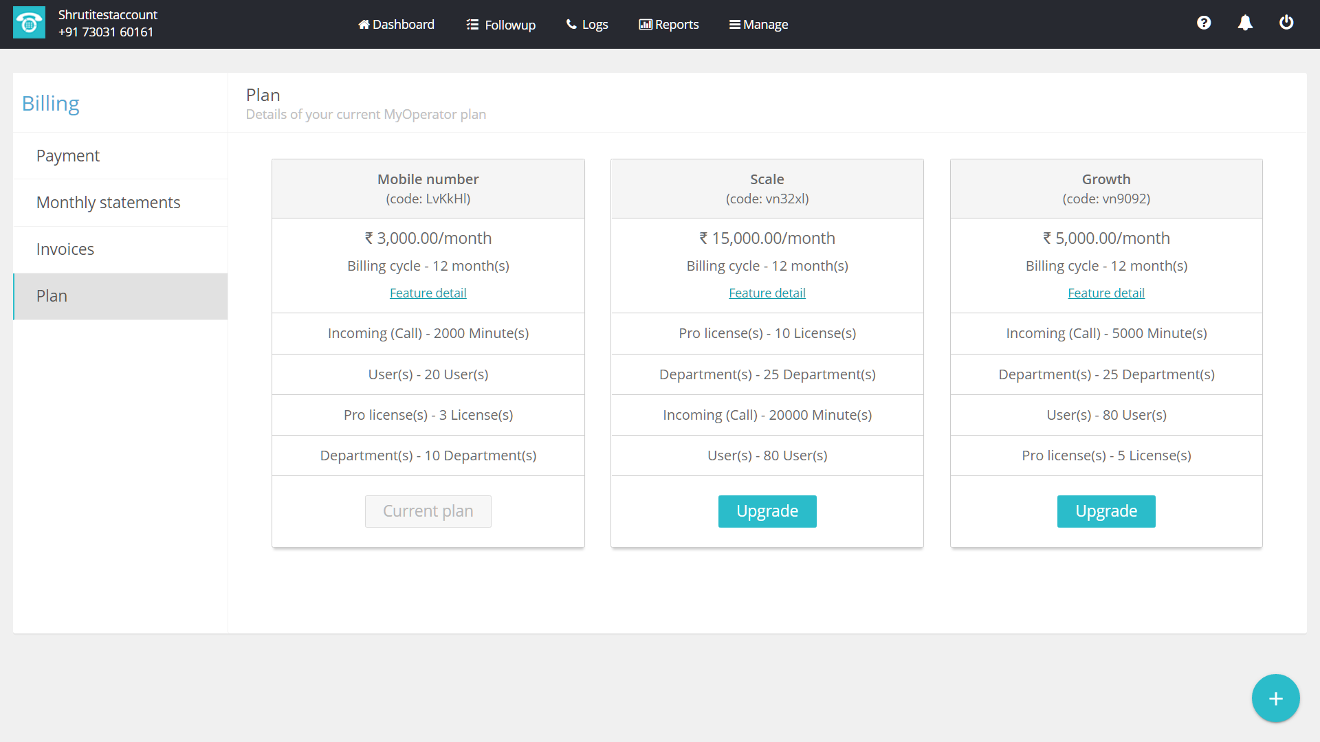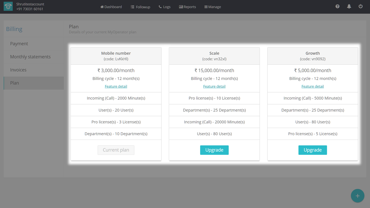 To view, the features of each plan, follow the steps mentioned below: 1. Login to your MyOperator account and click on the “Complete the setup” button at the bottom of the Dashboard page to upgrade your Demo account. 2. Click on “Plan and payment”. ...