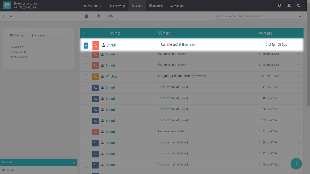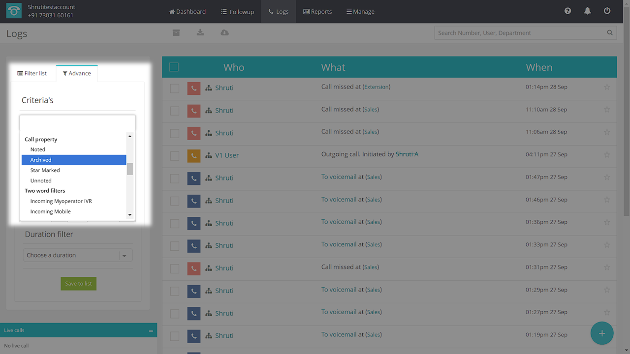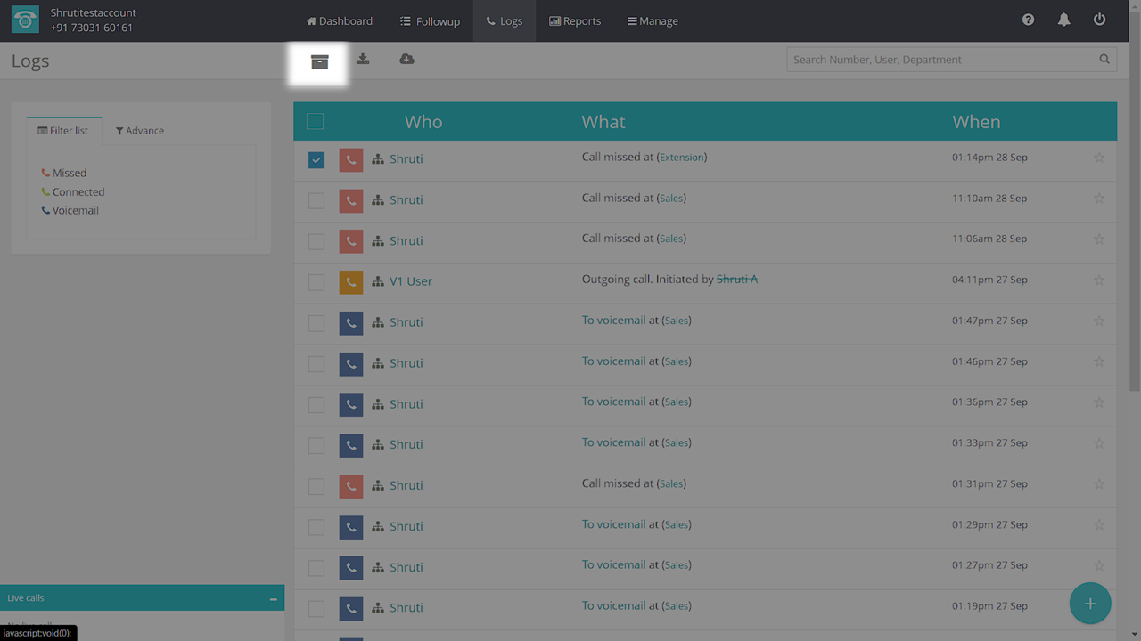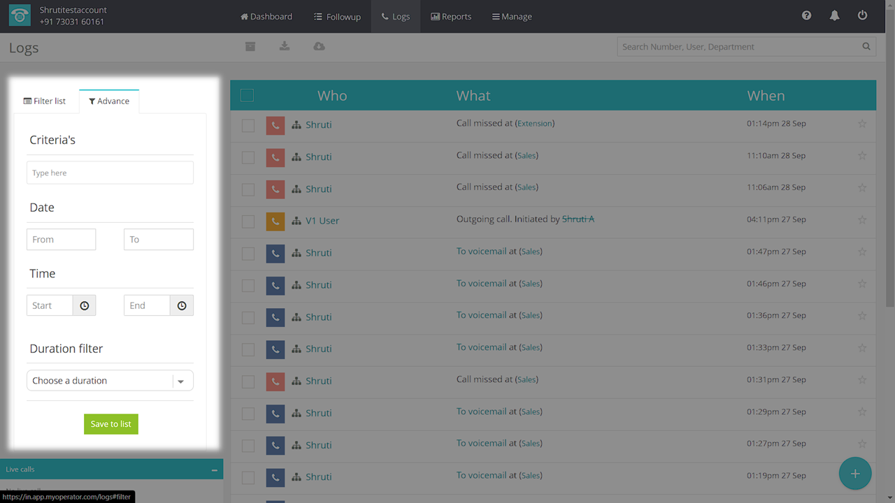 MyOperator offers you a call tracking solution, wherein the received, missed, and connected calls of your team are tracked and shown on your MyOperator Web App. These calls are displayed in the "Logs" section, which is available on the top black ...