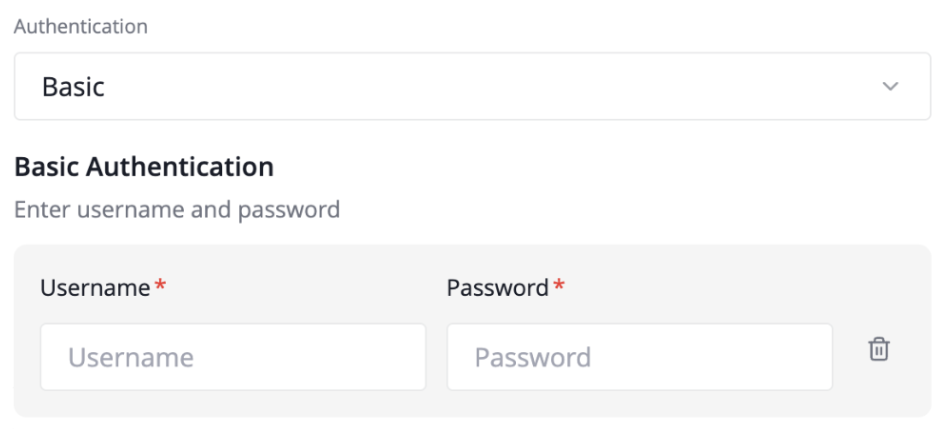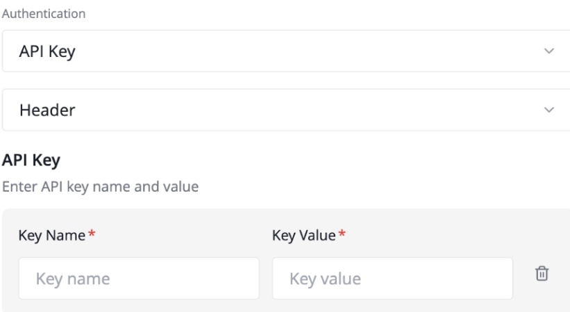 - API Key – Choose Header or Query, then Key Name + Key Value