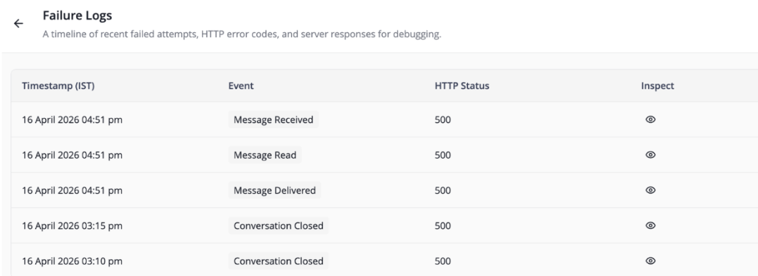 • View logs: ⋮ → Failure logs → Inspect (eye icon) shows pretty-printed JSON and HTTP status.