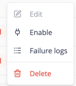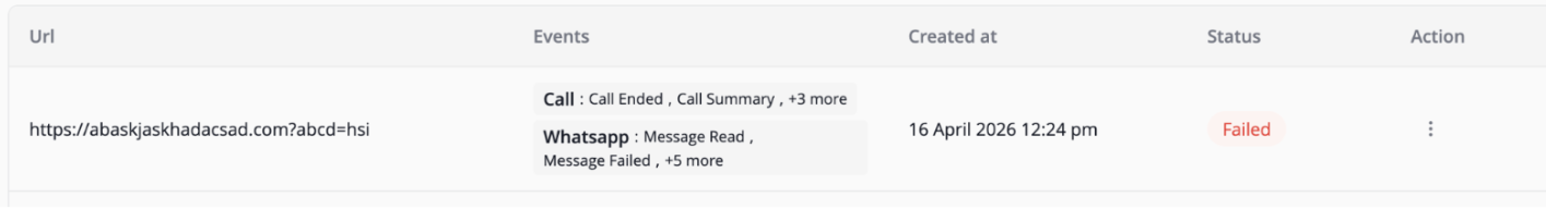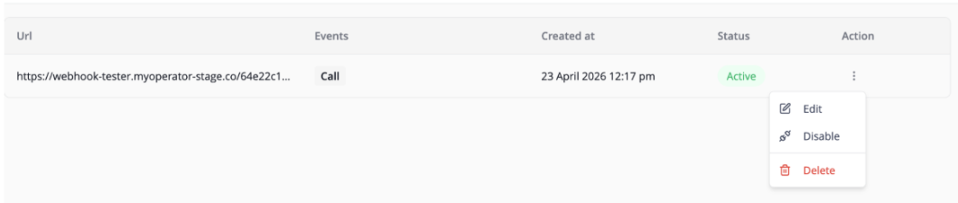 - From the Webhooks list, click the three-dot action menu (⋮) on the row you want to edit.