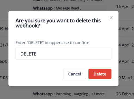 - A modal appears with a warning icon and the message: 'This action permanently deletes the webhook.' You must type 'DELETE' in uppercase to confirm.