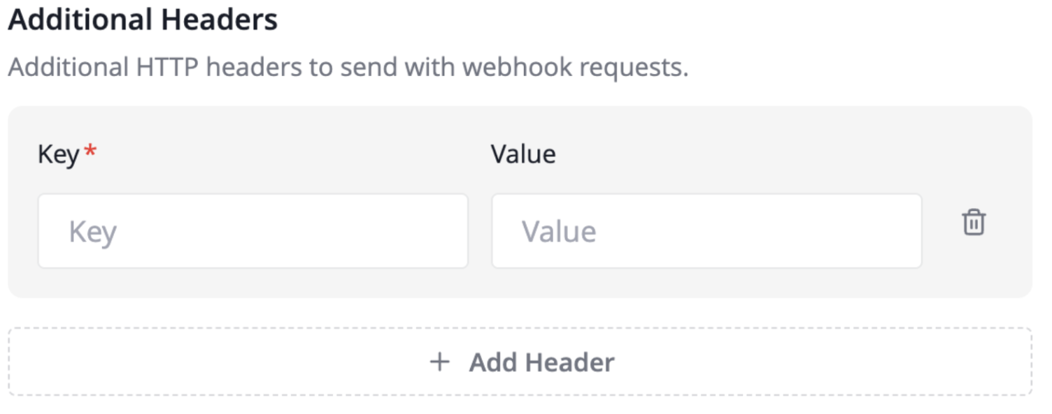 - Click '+ Add Header' to add a custom HTTP header row. Each row has a Key field (required) and a Value field (optional).