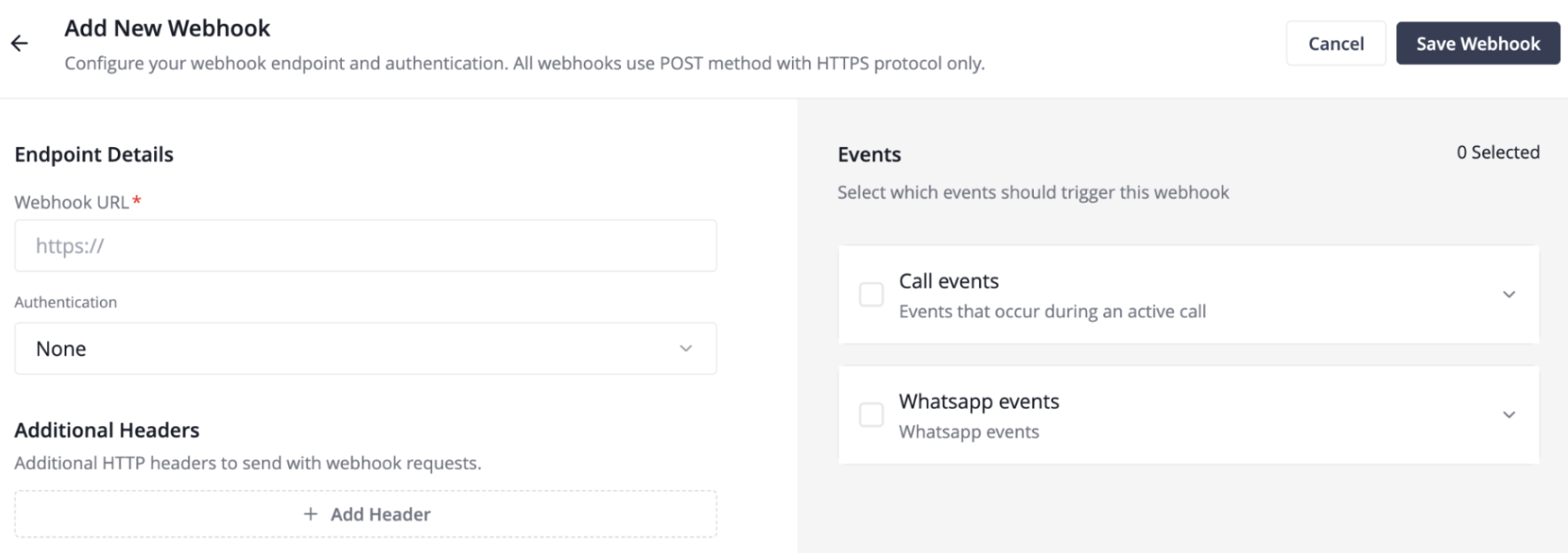 Webhook v2 lets Owners or Admins send real-time call and WhatsApp events to any HTTPS endpoint through a single, authenticated POST webhook. Create the webhook in Admin Panel → APIs & Webhooks → Webhooks (v2 tab), set authentication, pick the sub-events you need, and save. The system retries once after 3 seconds on failure and logs every unsuccessful delivery.