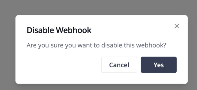 - A confirmation modal appears: 'Are you sure you want to disable this webhook?' Click Yes.