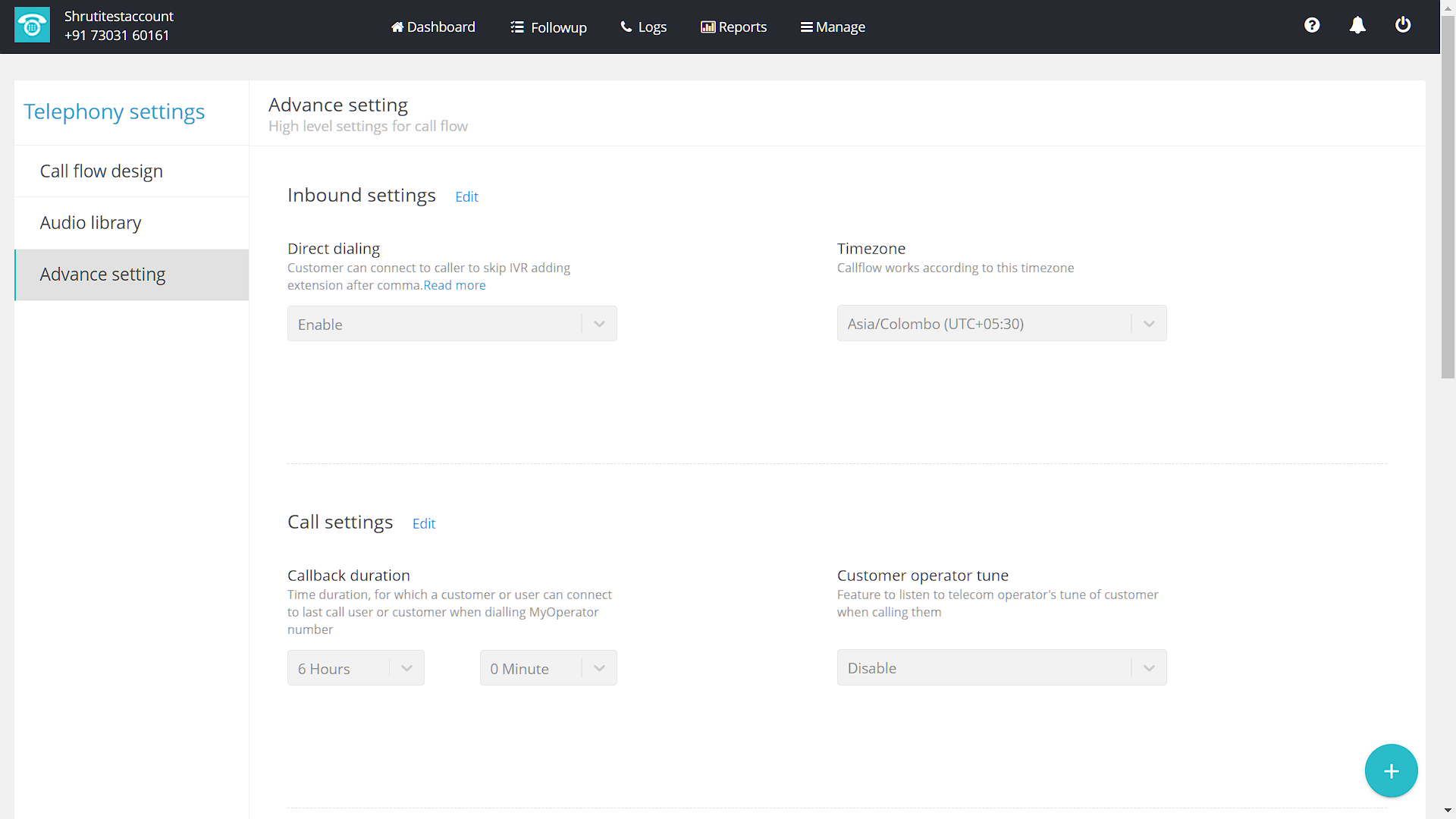 1. Login to your MyOperator panel and click on “Manage” at the top. 2. In the settings section click on “Design Callflow”. 3. Click on “Create new call flow” or "Edit Live call flow". 4. Click on the “Create Advance Call Flow” link. 5. Click on Add ...