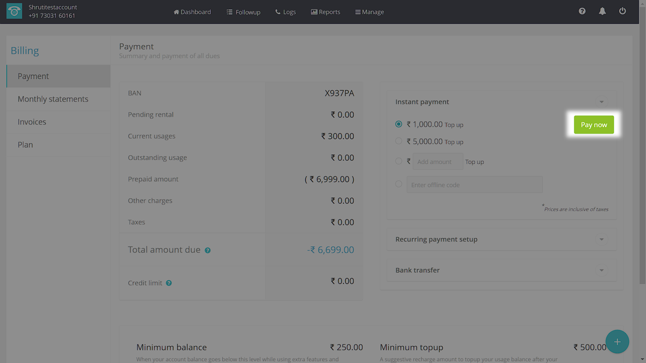 Overview: To recharge your MyOperator account or top up your balance, follow these simple steps to ensure your account remains active and functional. Pre-Recharge Checklist: Before you begin, make sure to: Log in to the MyOperator Admin Panel. Ensure ...