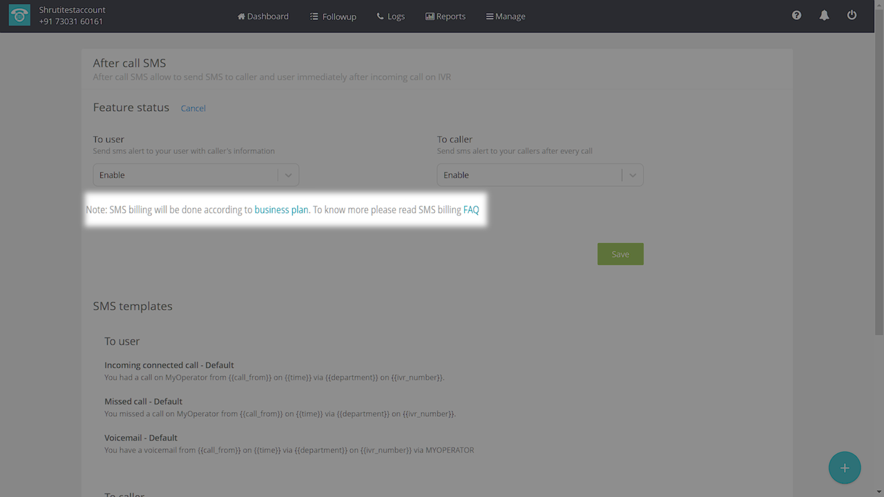 Applies to: Admins/Owners Outcome: Turn After-Call SMS on/off for callers and/or users, pick templates, and verify delivery. Time: 3–6 minutes Prerequisites Access: Admin rights to Communication/Automation and Billing. Compliance: DLT header (Sender ...