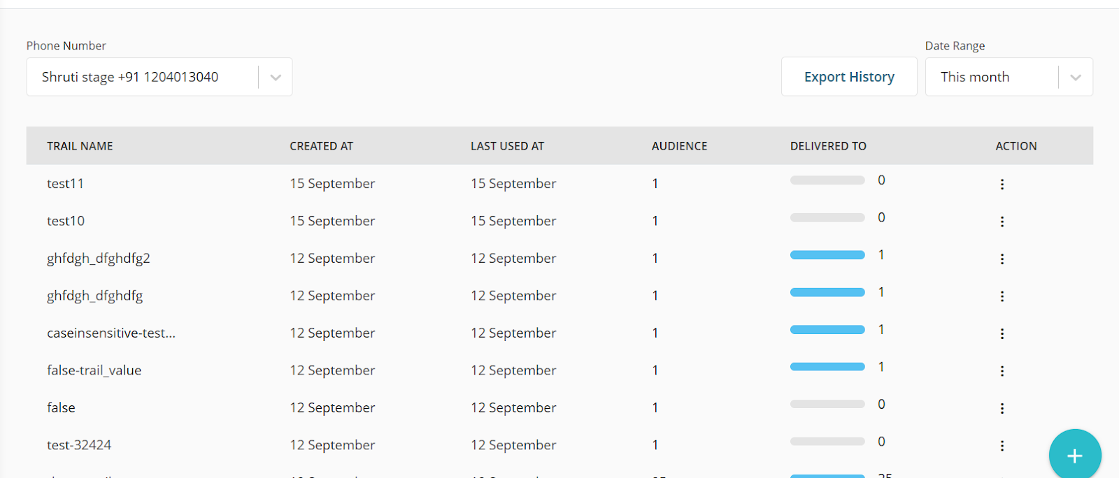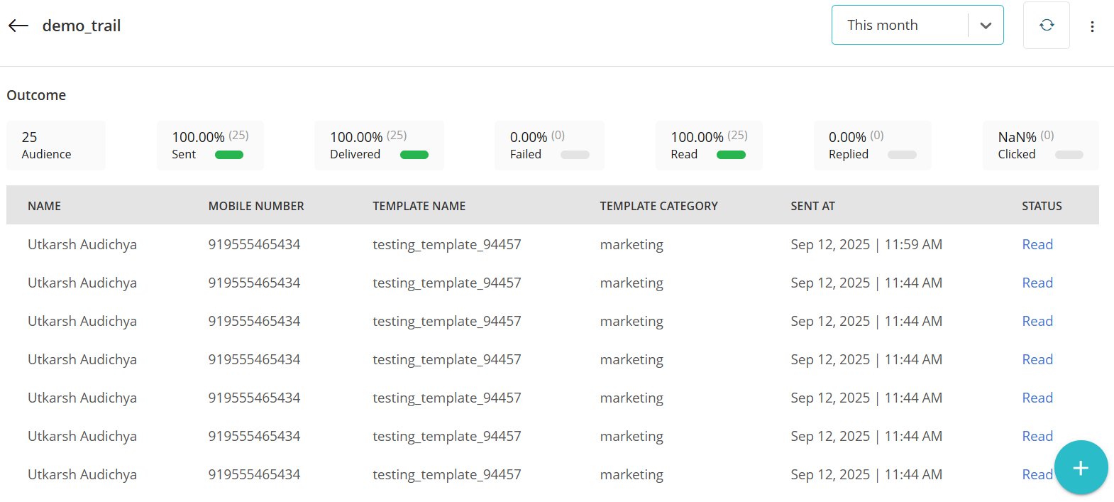 Message Trail lets you tag any WhatsApp template message sent via our API with a custom trail name (e.g., “OrderStatusUpdates”) and then view real-time delivery, read, and reply stats—plus export a detailed CSV report—right from your dashboard.