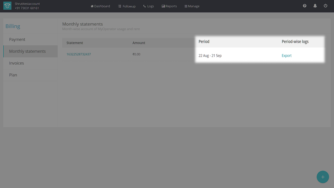 To export filtered logs, follow the steps mentioned below: 1. Login to your MyOperator panel and click on “Manage” at the top. 2. Click on “Exports” from the “Functionality” section. 3. Click on “Logs” on the left. Enter the customer number, keyword ...