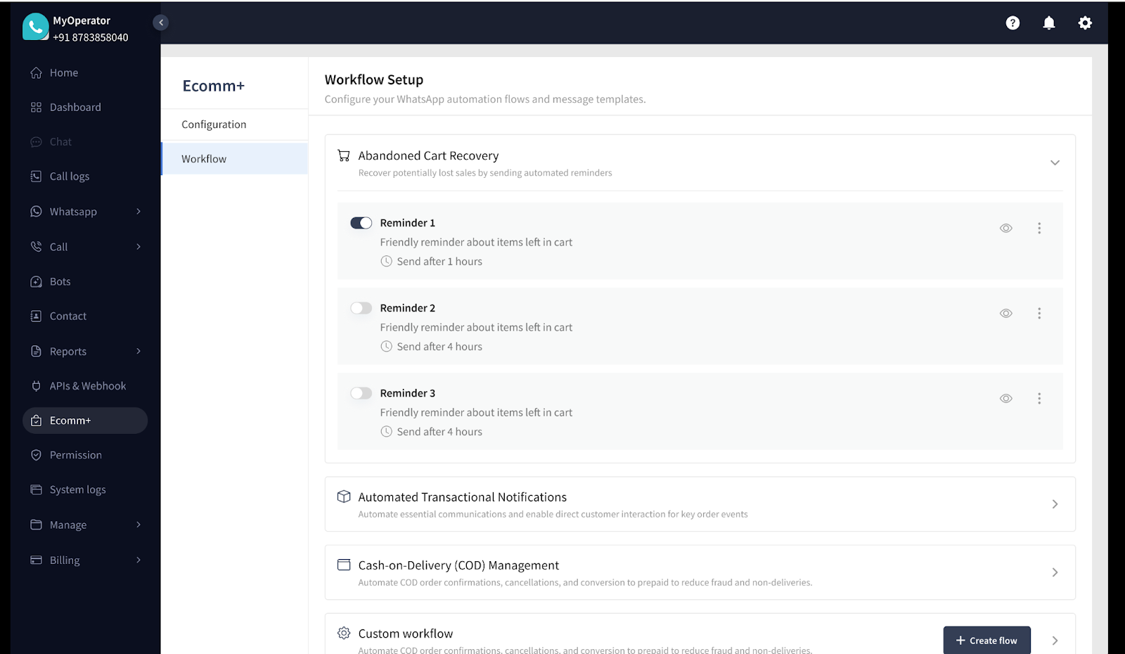 ⚡Quick answer - Inside MyOperator → Ecomm+ → Workflow, open Abandoned Cart Recovery, toggle each reminder ON (up to three), pick a pre-approved template, map the Shopify variables, set a delay between 15 minutes and 24 hours, test, then click Update ...